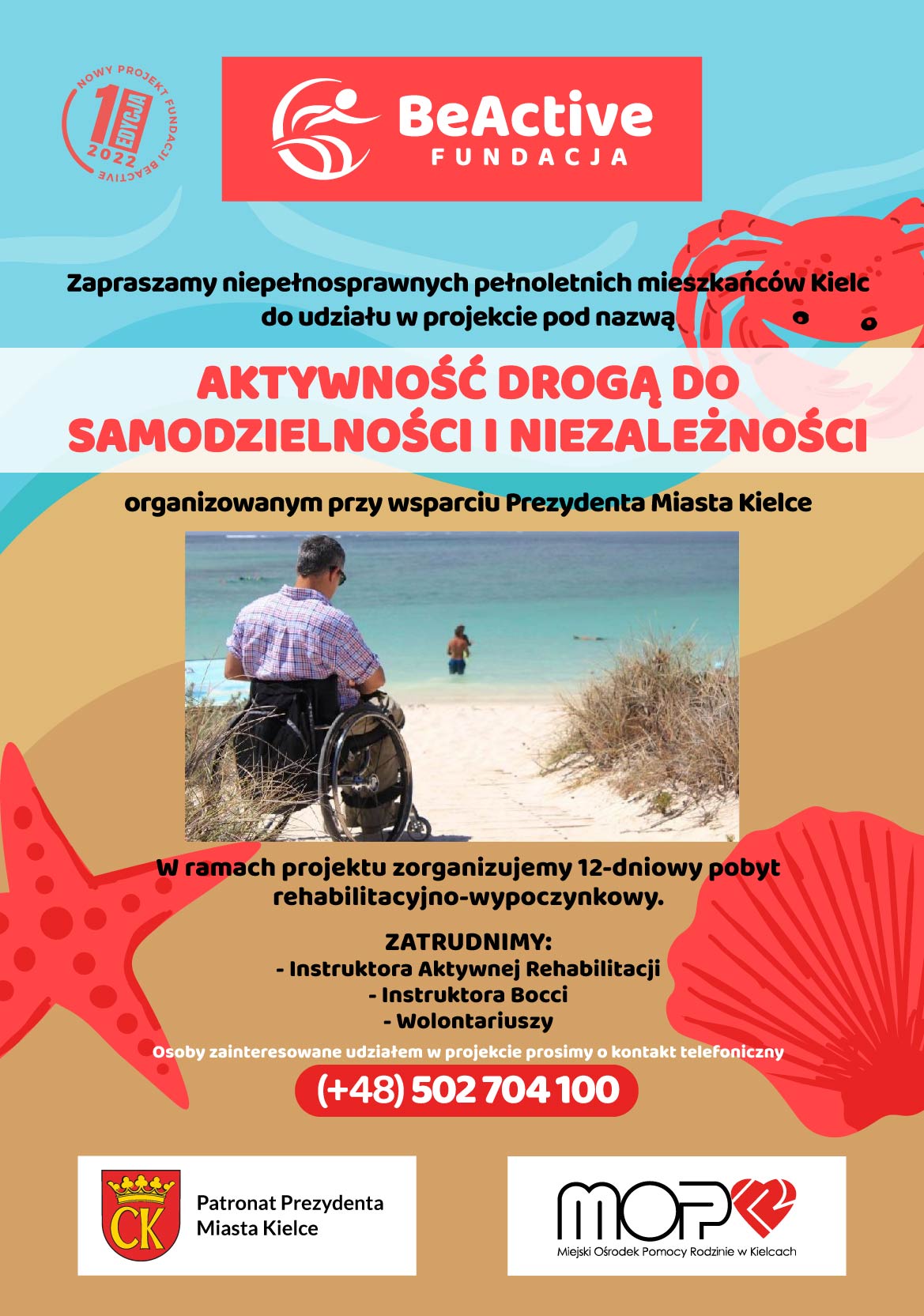 Projekt skierowany jest do 12 osób - niepełnosprawnych mieszkańców Kielc posiadających orzeczenia o niepełnosprawności. Beneficjenci wraz z oświadczeniem Rodo oraz kwestionariuszem rekrutacyjnym zobowiązani są do dostarczenia aktualnego orzeczenia o niepełnosprawności najpóźniej do 31.05.2023.